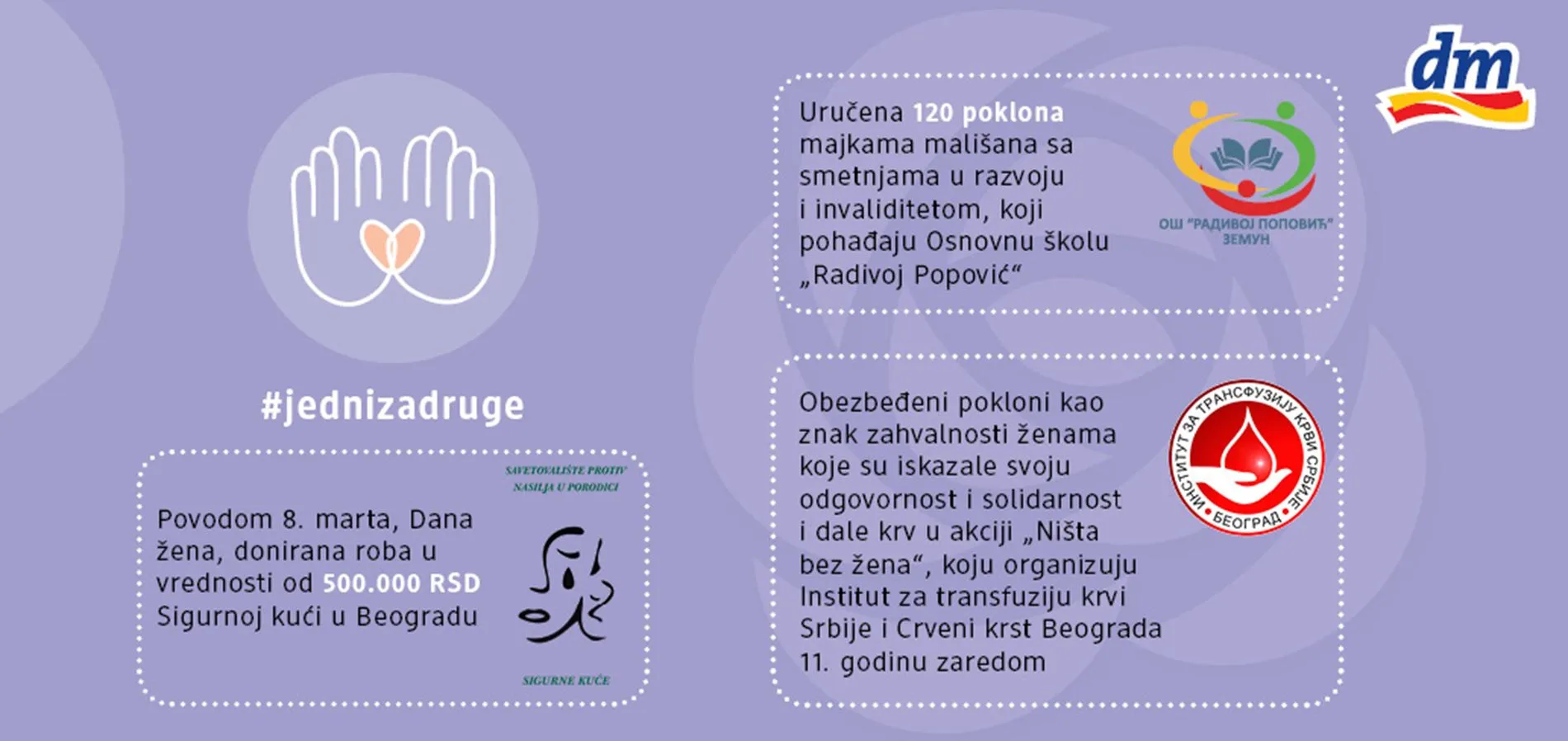 Povodom 8. marta, Dana žena, kompanija dm donirala je robu u vrednosti od 500.000 dinara Sigurnoj kući u Beogradu. Istim povodom, dm daruje poklone majkama dece s posebnim potrebama i ženama koje doniraju krv.Kao društveno-odgovorna kompanija, dm uvek teži tome da ukaže na izazove s kojima se društvo susreće, ali i da pruži podršku onima kojima je to najpotrebnije. Kako kažu iz drogerijskog lanca, već godinama posebnu pažnju poklanjaju ženama s ciljem da ih osnaže i utiču na poboljšanje njihovog položaja u društvu.