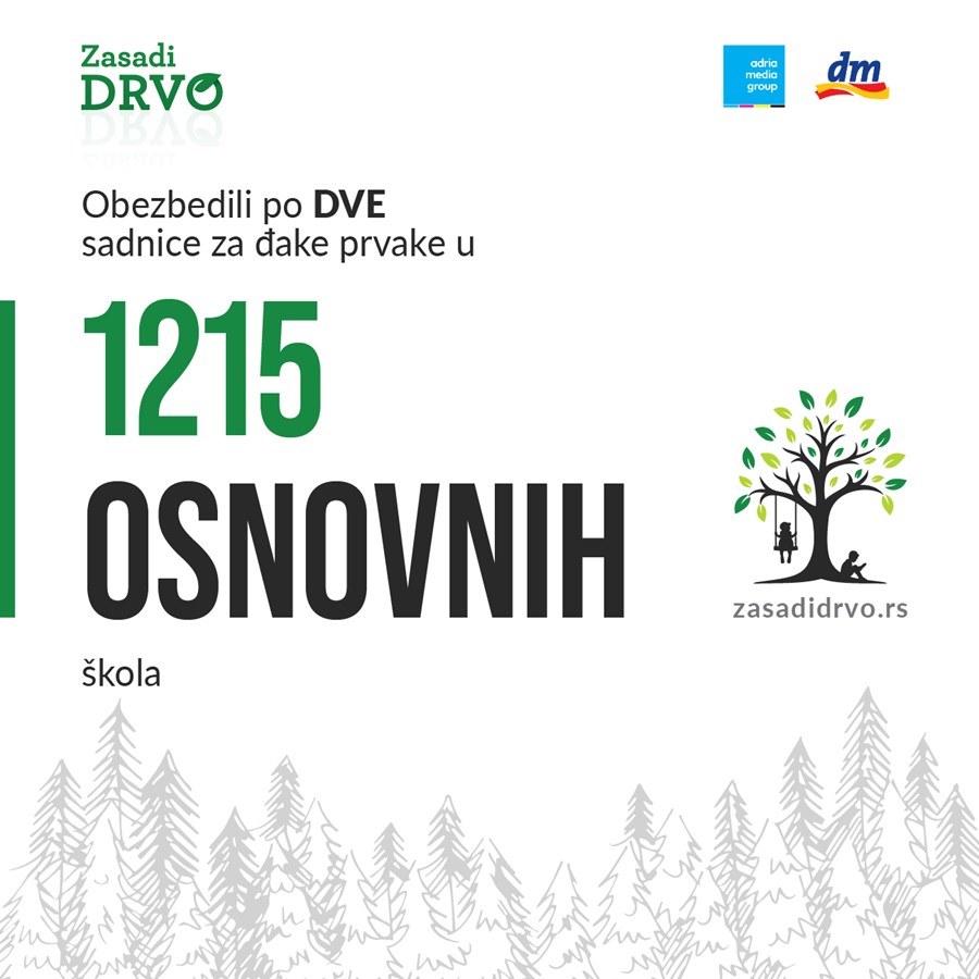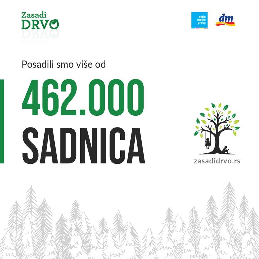 SRBIJA BOGATIJA ZA POLA MILIONA POSAĐENIH SADNICABeograd, 25.3.2023. – Zahvaljujući projektu „Zasadi drvo“, Srbija je bogatija za neverovatnih pola miliona (500.000) sadnica, koliko je do sada ukupno posađeno na više od 300 lokacija od 2019. godine. Ovaj jedinstveni poduhvat za zdraviju životnu sredinu pokrenule su kompanije dm drogerie markt i Adria Media Group uz podršku institucionalnih partnera, a realizovan je uz veliku pomoć građana.